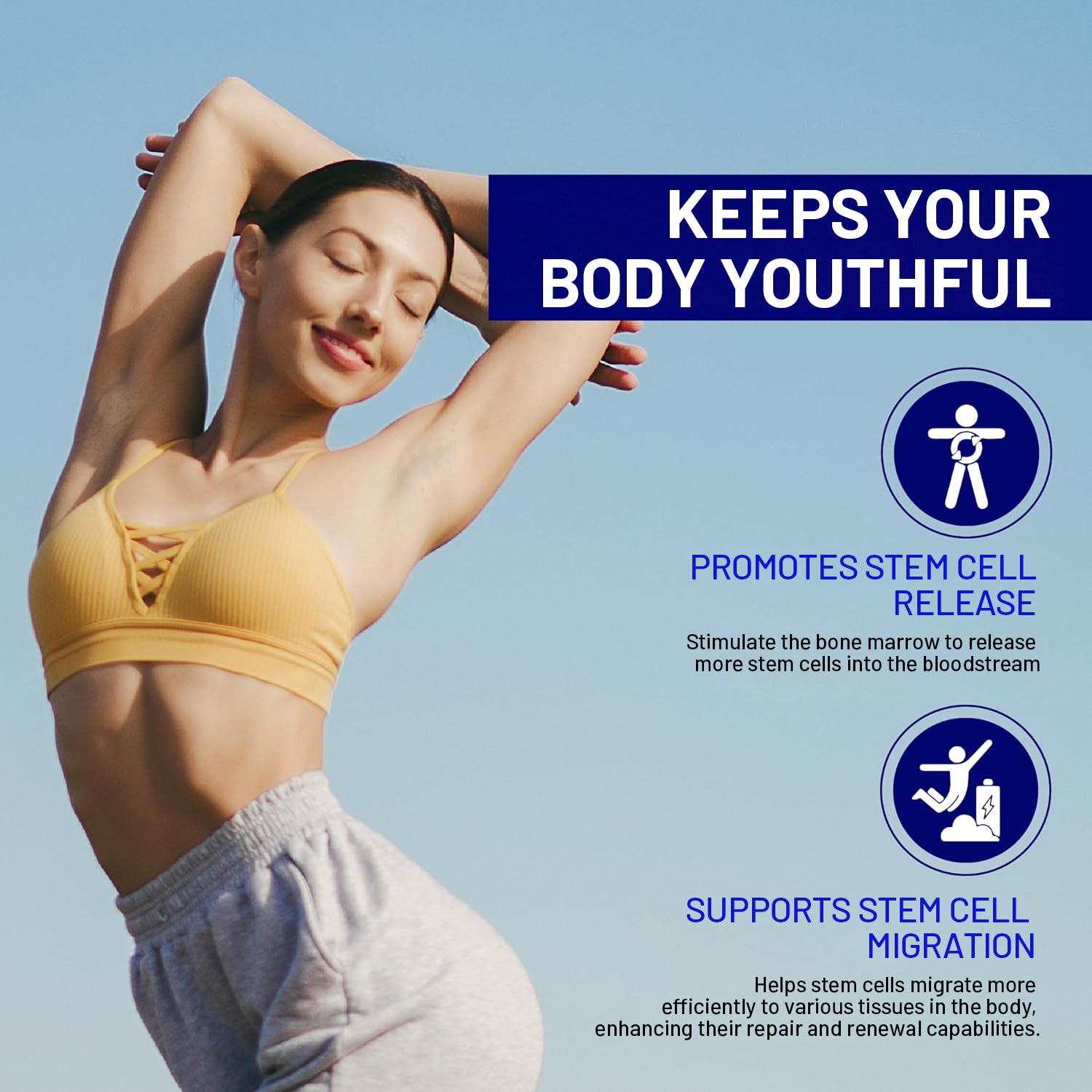 This stem cell supplement naturally increases your body's stem cell release, promoting self-repair. This reduces inflammation and soothes joints, muscles, and nerves, allowing you to regain energy, say goodbye to pain, and regain vitality.